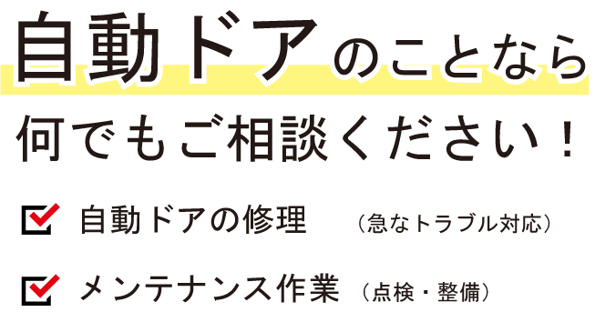 自動ドアの修理を基本作業料金8,000円から、メンテナンス作業(点検・整備)年1回20,000円から承っております。自動ドアのトラブル・メンテナンスに関するお悩みはお任せください!